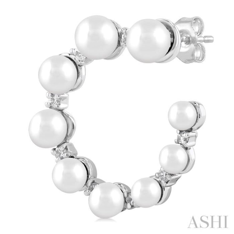 An attractive pair of Cultured Pearls and diamond half hoop earrings, these make for a fine selection for one's jewelry case. The earrings feature a graduated row of 9 each, total 18, round white Cultured Pearls, descending in order of size, from 4.5 MM to 2.8 MM, starting from the top and finishing at the other open end of the half hoop. 8 each, total 16, prong set round cut diamonds sit between the Cultured Pearls, in an alternating row of diamonds and Cultured Pearls. Push-back earnut closures secure the half-hoop earrings, which are molded in a rhodium finish 14 karat white gold. The total diamond weight is 1/5 Ctw.