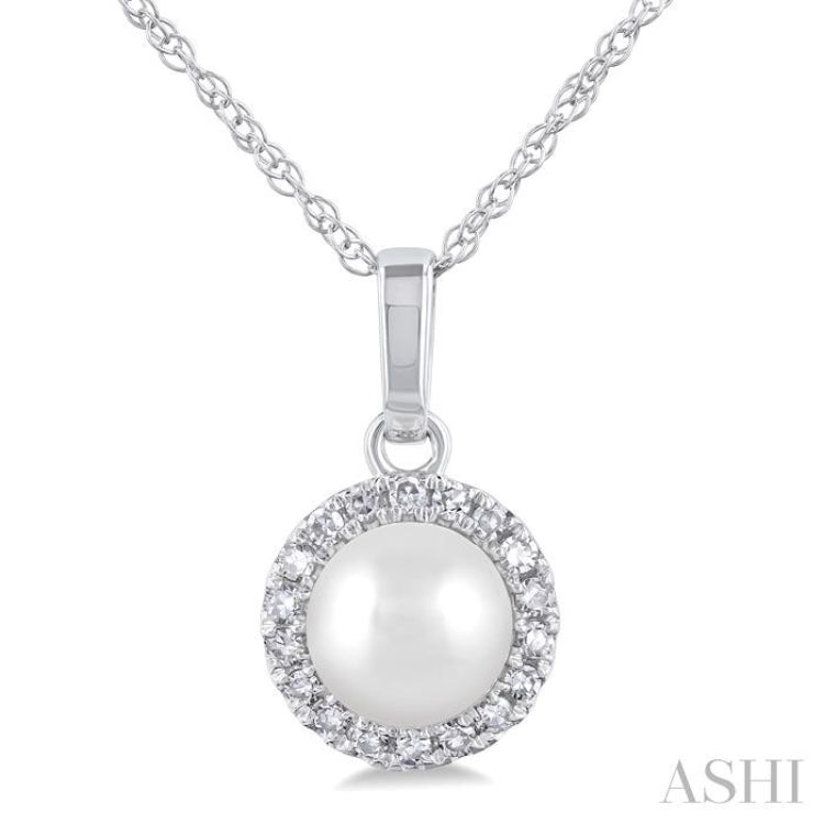 5 MM Cultured White Pearl and 1/20 Ctw Single Cut Diamond Halo Pendant With Chain in 14K White Gold