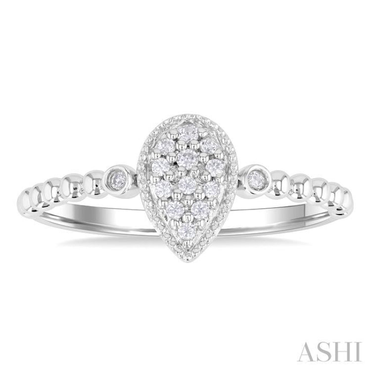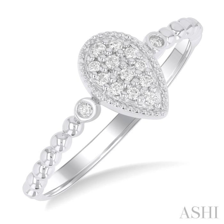 Delicate and elegant, this diamond fashion ring from the much sought-after Petite collection, is perfect for adding a touch of glamour to any occasion. The charming ring features a pear-shaped centerpiece adorned with 12 prong set round cut diamonds, adding sparkle and elegance to the design. Flanking the pear mount is a small circular mount, each embellished with a bezel set round cut diamond for added brilliance. A beaded shank enhances its unique and graceful appearance. The Petite fashion ring is crafted in a rhodium finish 10 karat white gold. The total diamond weight is 1/8 Ctw.
