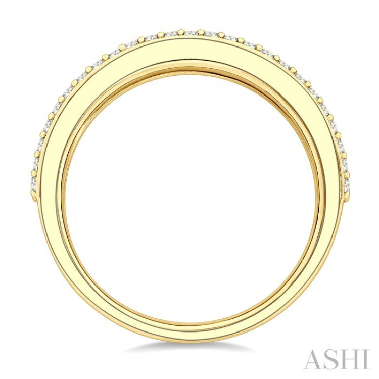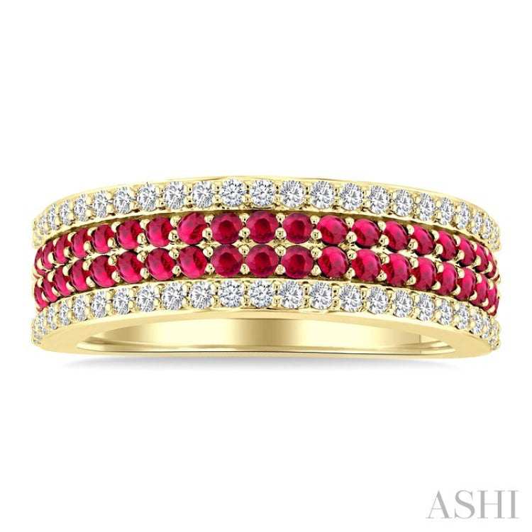 A celebration of color and brilliance, this precious fashion band features a striking twin row of 42 round cut 1.50MM rubies lining the center of the ring top. Bordering the vibrant rubies on either side are 25 each prong hand set round cut diamonds, adding a brilliant contrast. The harmony of vivid rubies and shimmering diamonds creates a captivating look, making this ring a stunning statement of elegance and style. The precious fashion band is styled in 14 karat yellow gold. Total diamond weight is 3/8 Ctw.