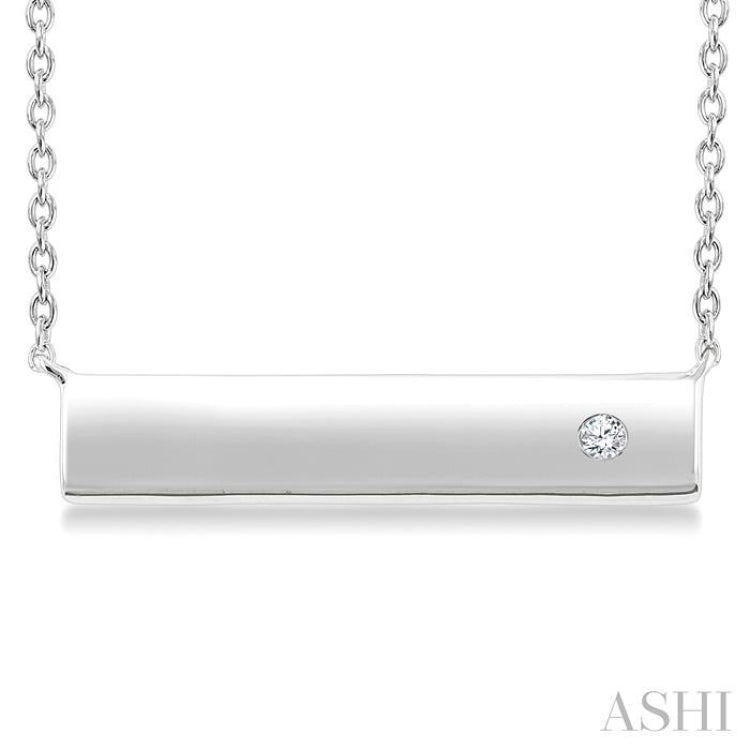A slender beacon of refined simplicity, this diamond fashion pendant marries minimalist form with a single point of sparkle. Elegance often lies in restraint and this pendant proves that a solitary diamond can transform a simple silhouette into a signature statement. At one end of the smooth bar is a petite flush set round cut diamond, its understated placement drawing the eye to that precise corner. Draping from a delicate 1.00 MM SSL cable chain, the clean lines of the bar offer a modern counterpoint to the gem's classic cut, creating a versatile piece that complements every ensemble. Both chain and diamond fashion pendant are molded in rhodium finish silver. Total diamond weight is 1/50 ctw.