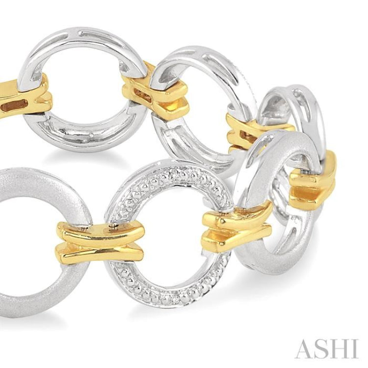A beautiful diamond bracelet fashioned in 14 karat yellow gold vermeil over sterling silver studded with 24 pave set sparkling round cut diamonds with the design of open work circles each connect with a bar of 14kt yellow gold vermeil. This bracelet fastens with a secure clasp. The total diamond weight is 1/10 Ctw.