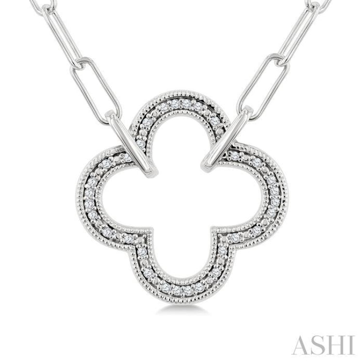 Revered as a symbol of luck, faith, hope, and love, the four-leaf clover brings more than just sparkle, it carries a promise of good fortune wherever you go. Add a touch of serendipity to your collection with this clover fashion pendant. Wear it as a personal talisman or gift it to someone destined for great things, and let its quiet shine guide you toward brighter days. Carved into a graceful open-window four-leaf clover, the pendant's silhouette is defined by 32 pave hand set single cut diamonds that trace each curve, while a milgrain finish frames the motif. An 18-inch 2.5 MM paper-clip chain, its elongated links providing a contemporary contrast, holds the fashion pendant, both of which are styled in rhodium finish silver. Total diamond weight is 1/10 ctw.